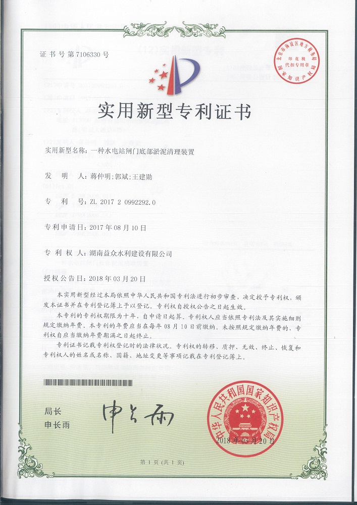 本实用新型公开了一种水电站闸门底部淤泥清理装置,包括第一刮板、搅拌螺杆、淤泥存放箱、第二铰接轴和装置底座,所述装置底座顶端的中心位置处固定有淤泥存放箱,淤泥存放箱的顶端设有进污口,所述淤泥存放箱一侧的装置底座顶端通过支撑台固定有第一吸污泵,所述横板顶端的中心位置处设有搅拌腔,搅拌腔靠近旋转柱一端的侧壁上固定有电机,所述装置底座远离第一固定板一端的侧壁上固定有相互对称的第二固定板,所述第二铰接轴底端的两侧固定有相互对称的伸缩柱,伸缩柱的底端安装有第二刮板。本实用新型不仅提高了淤泥清理时的便利程度,提高了淤泥清理时的工作效率,而且提高了淤泥清理时的效果。