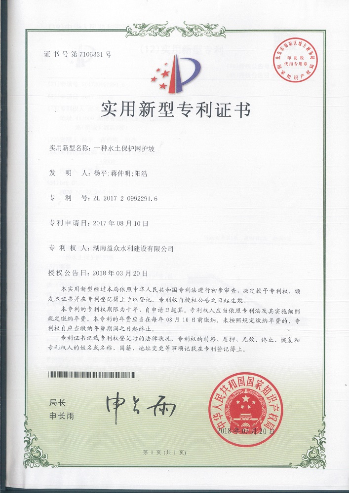 本实用新型公开了一种水土保护网护坡,包括一级园路、二级园路和设于一级园路、二级园路之间的斜护坡,所述斜护坡的底层为原浆砌块石护坡且原浆砌块石护坡嵌入设有六方块,所述原浆砌块石护坡的上部依次铺设有厚种植土层、水土保护网、薄种植土层和草坪,所述水土保护网与厚种植土、薄种植土层之间通过在水土保护网上穿设有若干个钢钉固定相连,所述一级园路浇筑时预留有长钢筋以实现长钢筋与水土保护网绑扎牢固,所述二级园路浇筑时也预留有长钢筋以实现长钢筋与水土保护网绑扎牢固。本实用新型提供的一种水土保护网护坡,既能够防止流水冲刷,又满足景观要求。