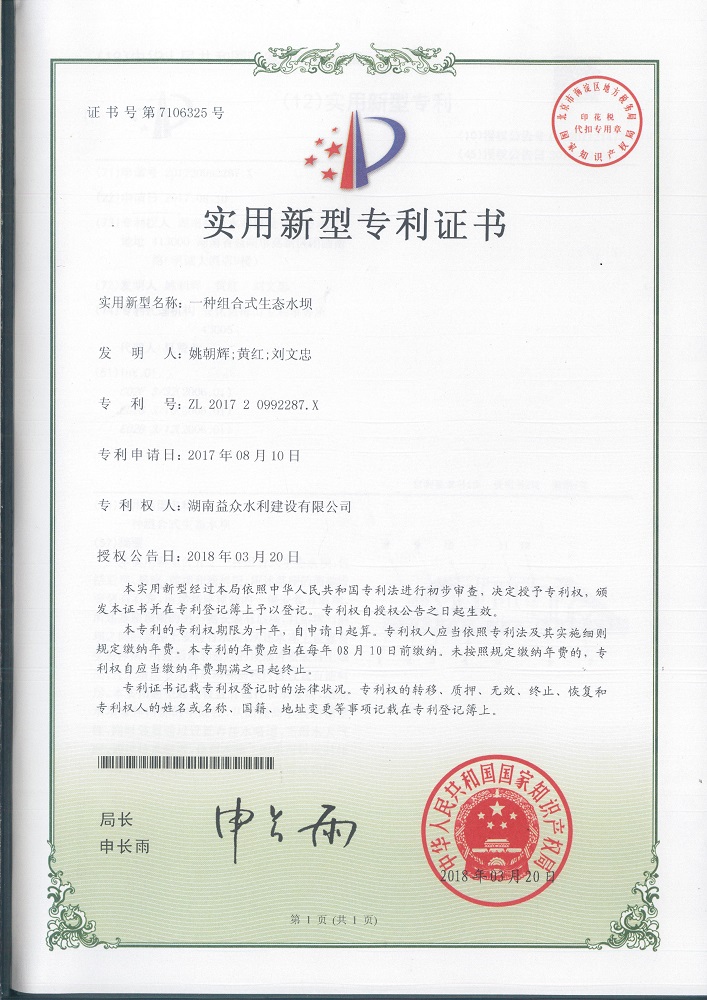 本实用新型公开了一种组合式生态水坝,包括后坝、基座、前坝和滤料层,所述基座的两端皆安装有石笼,所述基座顶端的一侧安装有前坝,所述基座顶端的另一侧安装有后坝,且后坝与前坝之间的基座上安装有水库,所述水库上设置有生态浮床,所述后坝和前坝的顶端皆安装有土壤层,且土壤层下方的后坝和前坝内皆设置有滤料层。本实用新型通过设置有锚杆和承重块,增加水坝整体内部的牢固性,从而提高水坝的稳定性,同时装置通过设置有排水暗道,当雨水天气时,通过排水暗道,使得水坝上的水可以及时排出,避免长时间的积水对水坝的坡体造成损伤。