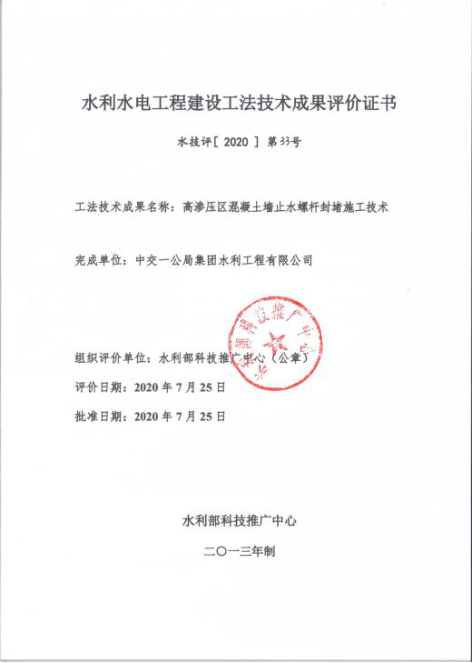 项目部以技术创新促进工程质量的提高为要求,依托技术创新、科技创新,针对耦合管安装定位精度难题进行技术攻关,实现了毫米级的耦合管精度控制,并以此形成《泵房耦合管安装施工工法》;为解决模板对拉螺杆后期防渗难题,对封堵方式和螺杆型式进行创新,形成了《高渗压区混凝土墙止水螺杆封堵施工工法》。两项工法经水利部科技推广中心鉴定,为国内领先水平,现已申报一公局级别工法和中国水利协会工法;同时施工现场形成的两项发明型和三项实用新型专利也正在申报中,都有效促进了公司工程质量总体水平的提高。