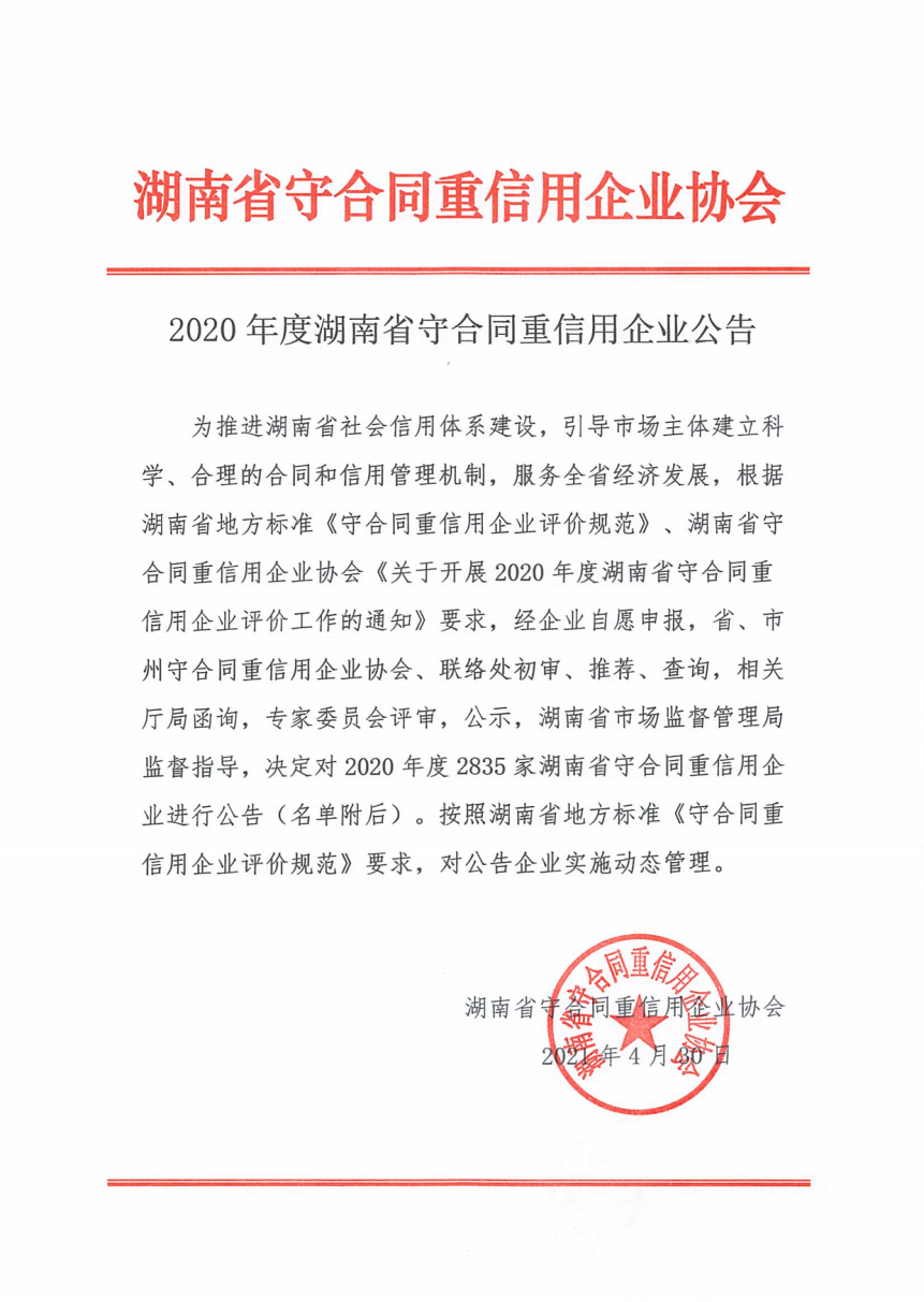 5月13日,公司被湖南省守合同重信用企业协会授予2020年度“湖南省守合同重信用企业”称号,这是公司连续第18年斩获此项殊荣。