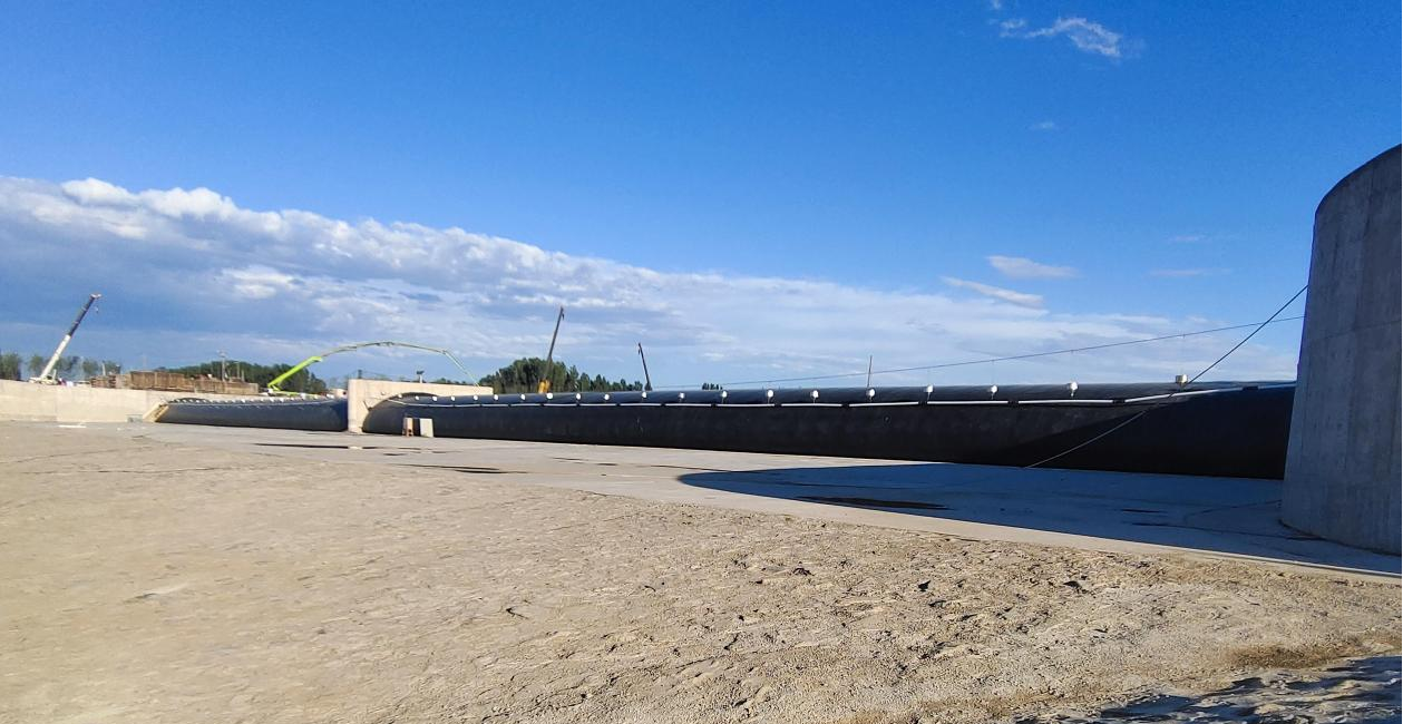 本项目于今年年初开工,工程工期紧任务重。为保证项目如期完工,项目部顶住疫情及春节假期压力,在保证安全和质量的前提下,采用轮班制,换人不换机,24小时昼夜施工,于5月20日顺利完成主体工程橡胶坝坝底、消力池、铺盖段、海漫及块石防冲槽等部分。随后,项目开始进行坝袋充水实验,经过36个小时的连续观察,坝袋无渗水漏水现象,充水试验顺利完成。本次试验成功,标志着橡胶坝施工质量已达到设计和技术标准要求,对于工程彻底完工及投入使用具有重要推动作用。