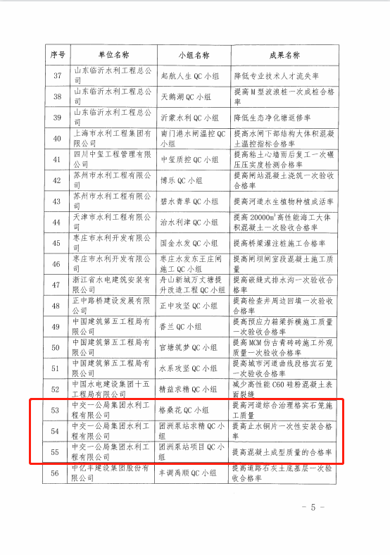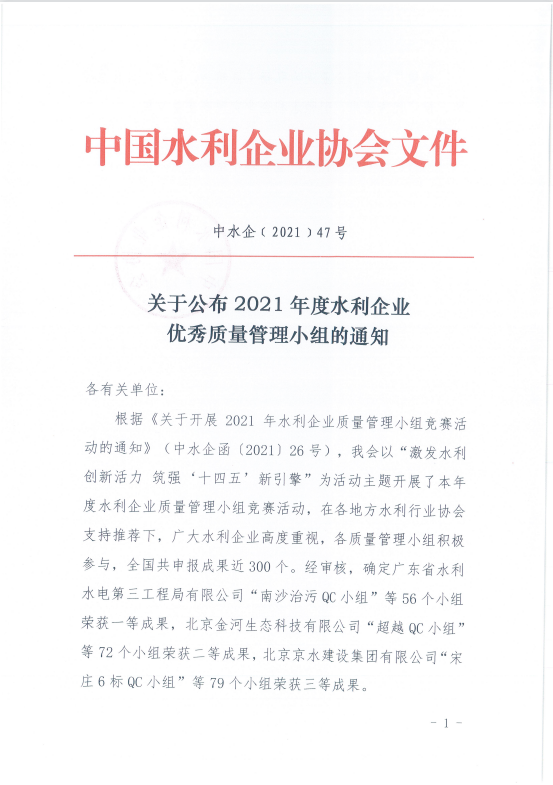 近日,公司团洲泵站项目QC小组“提高止水铜片一次性安装合格率”、团洲泵站求精QC小组“提高混凝土成型质量的合格率”及格桑花QC小组“提高河道综合治理格宾石笼施工质量”三个成果,在中国水利企业协会举办的2021年度质量管理小组竞赛活动中,荣获一等奖。