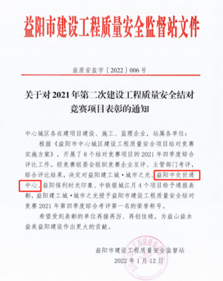 此次表彰,是对项目部日夜奋战、辛勤付出的肯定与认可,更是激励公司及项目部不忘初心、砥砺奋进的动力。公司将持续加强科学策划、精细组织,在品质建造、完美履约的路上永不止步,竭力打造精品工程,为建设益山益水、益美益阳作出更大贡献。