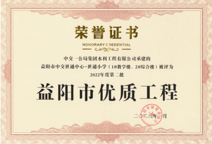 近日,公司益阳市中交世通中心-世通小学(1#教学楼、2#综合楼)项目被评为2022年度第二批益阳市优质工程。