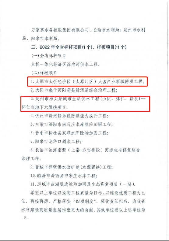 近日,山西省水利厅公布了关于2022年水利工程建设样板项目和标杆项目的通报,公司承建的太原市太忻经济区(太原片区)大盂产业新城防洪工程和朔州市神头泉城市生活供水工程(山阴、怀仁、应县)—怀仁市地下水置换项目榜上有名,被列为山西省2022年水利工程建设样板项目。