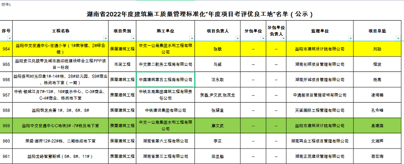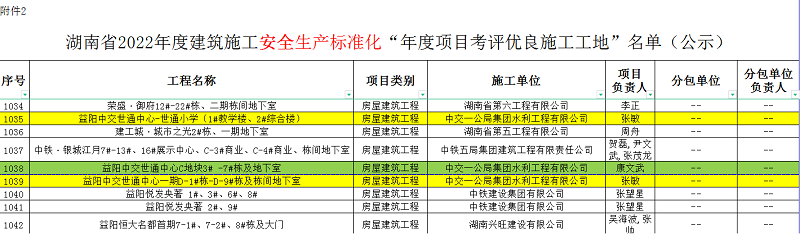 近日,湖南省住房和城乡建设厅公布《湖南省2022年度建筑施工质量管理、安全生产标准化“年度项目考评优良工地”名单》,由公司承建的“益阳中交世通中心-世通小学(1#教学楼、2#综合楼)”、“益阳中交世通中心C地块3# -7#栋及地下室”、“益阳中交世通中心一期D-1#栋-D-9#栋及栋间地下室”等多个项目获得“建筑施工安全生产标准化年度项目考评优良施工工地”、“建筑施工质量管理标准化年度项目考评优良工地”等多项荣誉。